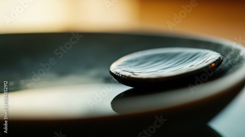 A close-up shot of a button's surface, capturing the texture and design, with a blurred view of the dish behind.