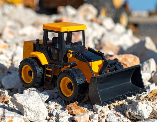 A close-up shot of a small, bright yellow and black toy front-end loader parked among rough, light-colored rocks
