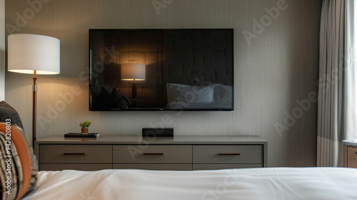 A close-up shot of a wall-mounted flat-screen TV in a modern bedroom, with a sleek dresser below.