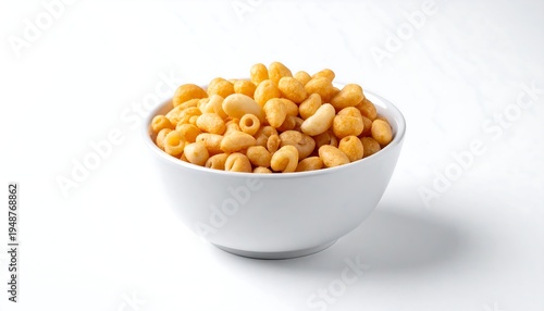 A close-up shot of a white bowl overflowing with golden, bite-sized pasta shapes, set against a pristine white backdrop