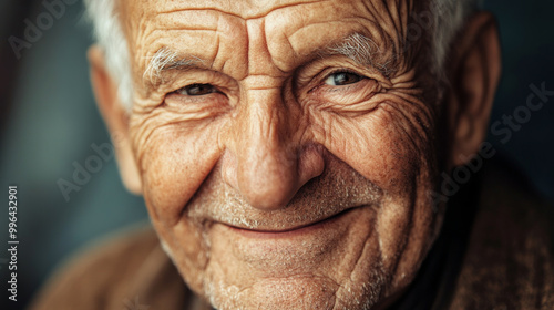 A close-up shot of an elderly man smiling with happiness, showing deep wrinkles and a warm expression