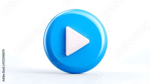 A close-up, studio shot of a glossy, bright blue circular play button with a white triangle symbol, isolated on a clean white background.