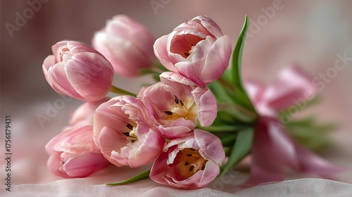 A close-up, top-down photograph of a beautiful bouquet of fresh light pink tulips, a delicate pink ribbon tied in a neat bow Delicate Floral Gifting and Celebration Feminine and Soft Aesthetics