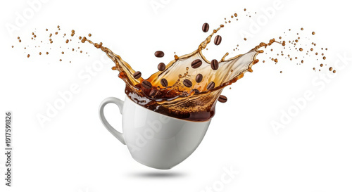 A close-up view of a cup of coffee with a splash of milk creating an artistic pattern.