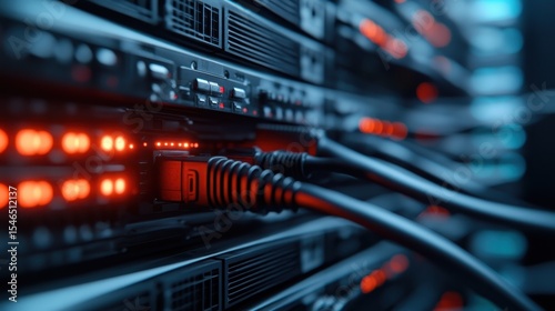 A close-up view of a high-tech server room, showcasing the intricate network connections and glowing red lights, portraying the technological advancements and power of modern digital infrastructure.