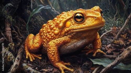 toad, amphibian, frog, nature, forest, wildlife, animal, wild, green, brown, yellow, leaf, tree branch, twig, jungle, rainforest, reptile, closeup, macro, environment, skin, textured, eye, fauna, biology, life, ecology, habitat, creature, wetland, swamp, duck pond, water, ground, sitting, looking, bush, tree, tropical, diversity, organic, life cycle, organism, natural, beauty, colours, pattern, texture, detail