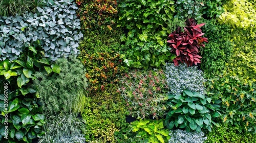 A close-up view of a lush green living wall, showcasing different plant textures and colors in a vertical garden setting.