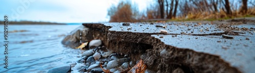A close-up view of a riverbank erosion, featuring rocks and a serene water body, highlighting the beauty of nature and landscape.
