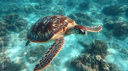 A close-up view of a sea turtle swimming gracefully in crystal-clear turquoise waters, surrounded by colorful coral reefs