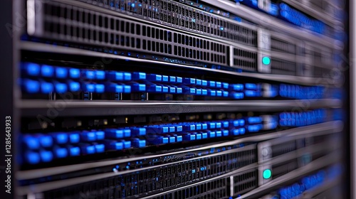 A close-up view of a server rack displaying multiple blue LED lights, emphasizing a high-tech data center environment.