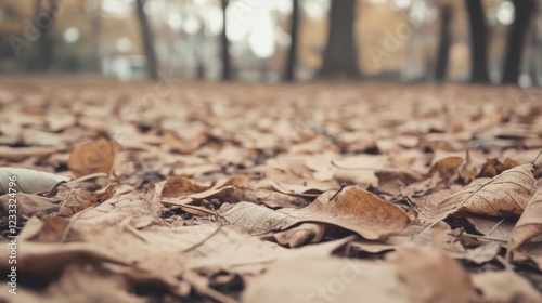 A close-up view of autumn leaves scattered on the ground in a tranquil park setting