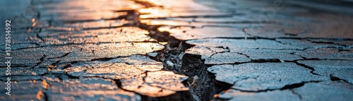 A close-up view of cracked pavement, highlighting the texture and patterns formed by the fissures, illuminated by warm sunlight.