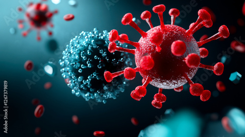 A close-up view of virus particles, showcasing red and blue structures, illustrating the microscopic world of pathogens and their interactions.