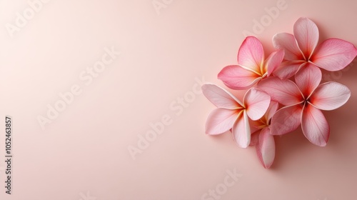 A cluster of pink frangipani flowers is artfully arranged on a similarly hued pink background, creating a serene and harmonious visual of natural beauty.