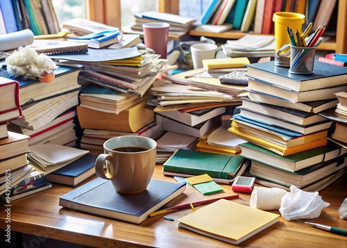 A cluttered desk is overrun with towering stacks of worn textbooks, notes, and binders, surrounded by scattered papers, pens, and a lonely coffee mug.