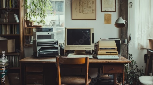A cluttered vintage workspace featuring an old computer, wooden desk, and retro chair.