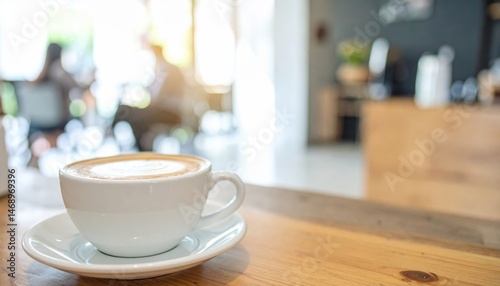 A coffee cup sits on a wooden table, with a blurred background of people enjoying themselves in a cozy café