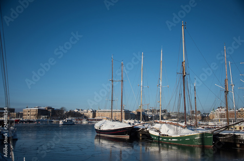 A cold winter morning in Stockholm with snow and ice on islands and boats