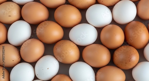 A collection of brown and white eggs, creating a natural and organic food background, top view