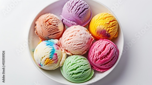 A collection of colorful ice cream scoops arranged in a bowl on a white background. The variety of flavors and vibrant colors stand out.