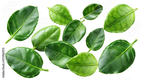 A collection of fresh vibrant green kaffir lime leaves scattered in a natural arrangement isolated on transparent background