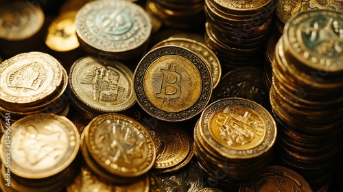 A Collection of Golden Bitcoin Coins Sparkling Amidst Stacks of Cryptocurrency Coins Reflecting the Future of Digital Finance and Investment Opportunities