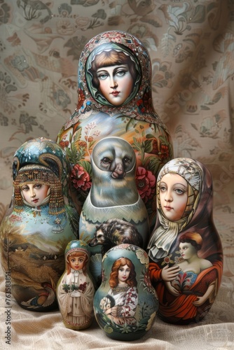 hand-painted, group, sitting, row, traditional, craftsmanship, colourful, design, intricate, russian, matryoshka doll, wood, wooden, collection, display, arrangement, size, pattern, detailed, unique, handcraft, decorative, art, set, doll, artwork, creativity, cultural, folk art, artisan, patterned, stack, tradition, artistic