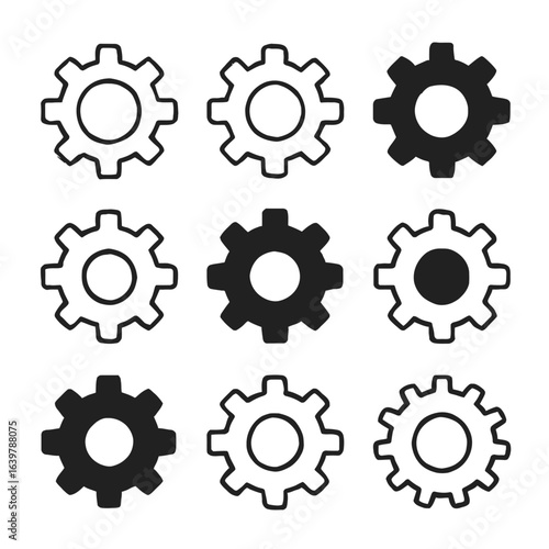 A collection of nine black and white gear icons in various styles.