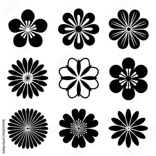 A collection of nine stylized black flower icons arranged in a grid on a white background, each with unique petal shapes and symmetrical designs, representing floral patterns.
