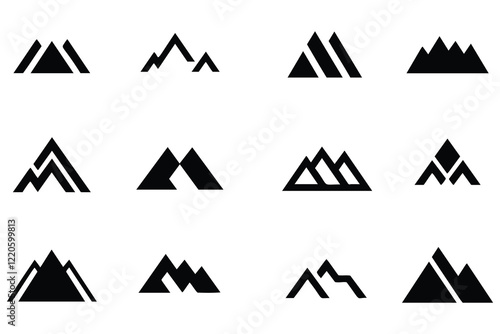 mountain, icon, logotype, graphic, design, black-and-white, simple, modern, minimalist, geometric, illustration, vector, shape, triangle, peak, nature, outdoors, travel, adventure, camping, hiking, climbing, silhouette, graphic design, symbol, set, collection, digital artwork, tour tourism, downloadable, clip art, printable, vector graphics, white background, isolated, mountain chain, landscape