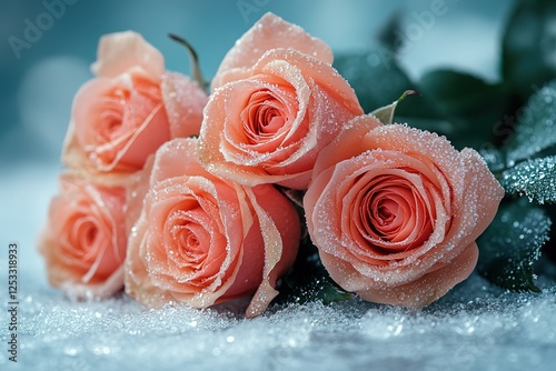 A collection of peach-colored roses dusted with shimmering crystals The roses are fresh soft and luminous with a dewy effect