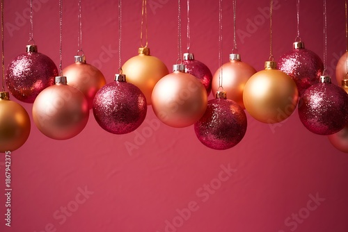 a collection of shimmering spherical christmas ornaments in shades of gold pink and red suspended against a vibrant magenta backdrop