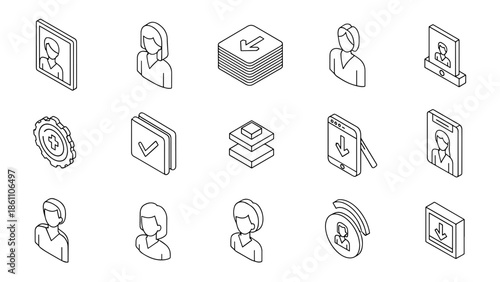 icon, isometric, illustration, graphic, design, vector, black, white, simple, outline, download, file, user, profile, picture, image, portrait, person, female, woman, check, approved, layer, stack, interface, technology, mobile, phone, arrow, signs, support, client, service, circle, gear, setting, process, concept, datum, network, communication, symbol, digital, web, application, art, style, modern, creative