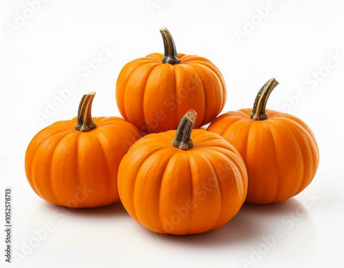 A collection of small, vibrant orange pumpkins, isolated on a white background