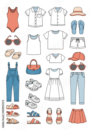 swimwear, hat, sandal, sunglasses, flip-flop, short, overall, t-shirt, tank top, dress, skirt, jean, baseball cap, pursed, clog, children's wear, beachwear, casual attire, apparel, footwear, accessory, garment, ensemble, attire, garment