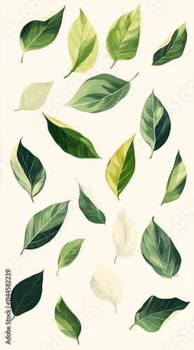 A collection of various leaf illustrations in different shades and shapes on a light background.