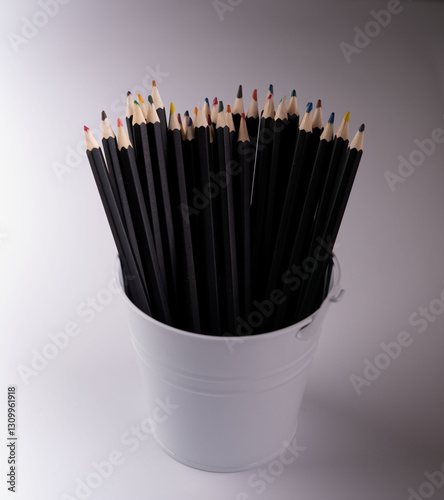 A collection of vibrant colored pencils in a sleek white holder showcasing assorted colors for creative artistic and educational use in drawing and sketching projects