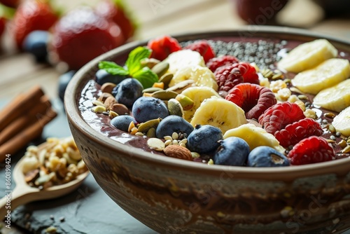 acai, bowl, fruit, berry, banana, raspberry, blueberry, nut, seed, granola, almond, pumpkin, mint, healthy, breakfast, delicious, colourful, alimentary, vegan, vegetarian, smoothie, food, drink, dessert, snack, fresh, organic, natural, tasty, sweet, tropical, summer, energy, vitamin, antioxidant, lifestyle