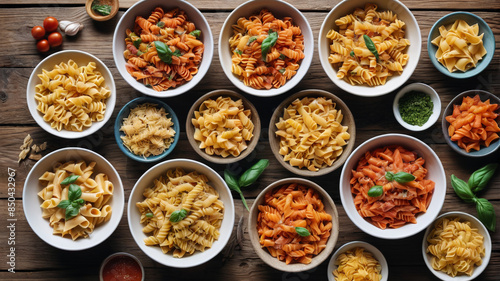 A colorful array of pasta varieties, including fusilli, penne, and spaghetti, arranged in bowls on a rustic wooden table, Generative AI