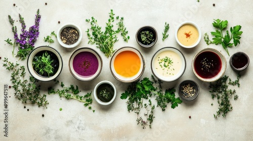 A colorful array of soups and herbs arranged artistically on a neutral background.