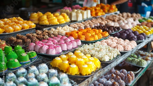 A colorful array of Vietnamese desserts displayed at a local market, showcasing the diversity of textures and flavors