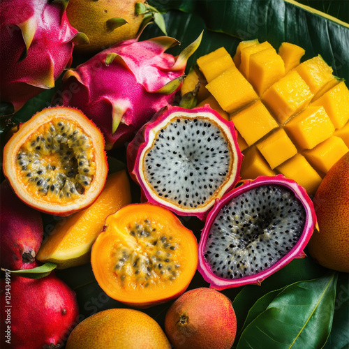 A colorful assortment of exotic fruits sliced open, dragon fruit, passionfruit, and mango, tropical leaves as background, vibrant hues, sharp details, fresh and juicy essence.