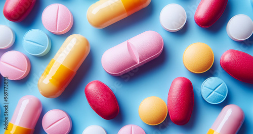 A colorful assortment of pills are scattered across a blue background. The pills come in various shapes and sizes, with some being round and others being oval. Concept of variety and diversity