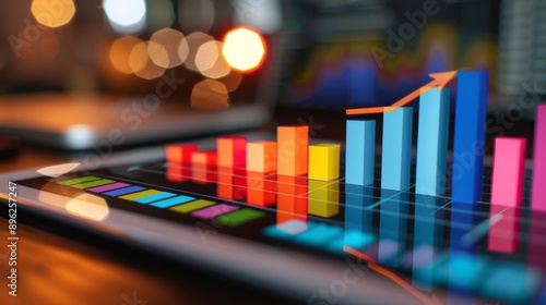 A colorful bar graph displayed on a tablet, indicating growth in various sectors