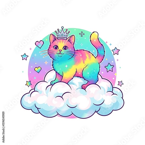 cat, felino, animal, pet, cartoon, illustration, drawing, rainbow, colourful, pastel, cloud, fluffy, sky, star, heart, crown, princess, queen, tiara, magic, fantasy, whimsical, cute, adorable, sweet, happy, joyful, fun, playful, dreamy, bright, vibrant, cheerful, artistic, design, graphic, art, vector, isolated, background, decoration, decorative, element, print, sticker, card, poster, childcare center