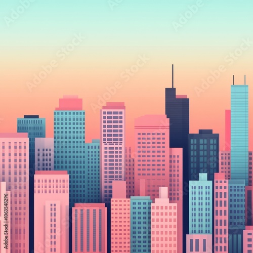 A colorful city skyline at sunset with modern buildings and soft hues.