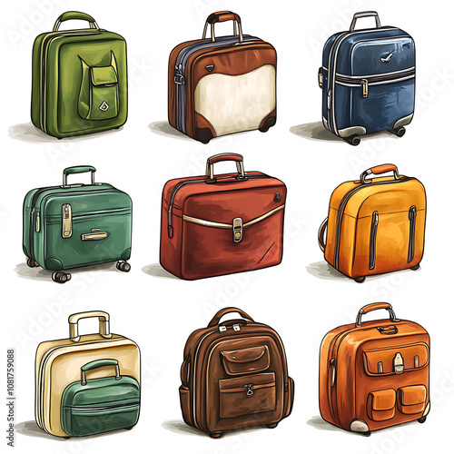 A colorful collection of travel bags and suitcases displayed on a clean surface, showcasing various styles and designs for every trip