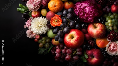 fruit, flower, apple, orange, grape, assortment, colourful, fresh, bounty, nature, vibrant, harvest, abundance, happiness, joy, celebration, organic, photo, modern, bright, nourishment, elegant, display, bouquet, floral, leafy, healthy, still life, culinary, variety, garden, summer, fall, dahlia, peony, blackberry, raspberry, food, decorative, black background, appetising, tempting, classic, bountiful