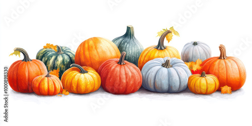 A colorful collection of various pumpkins in different shapes and sizes, showcasing shades of orange, green, and white, perfect for autumn decorations.