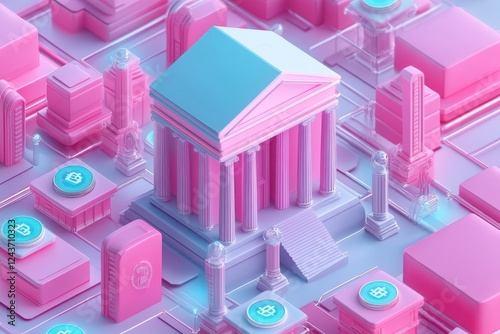 A colorful digital cityscape featuring a central building with a classical design, surrounded by modern structures and elements, all in pink and blue hues.